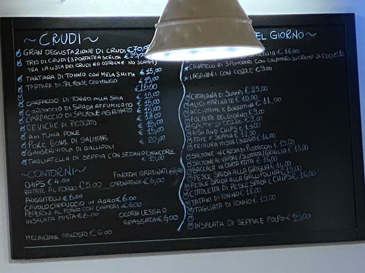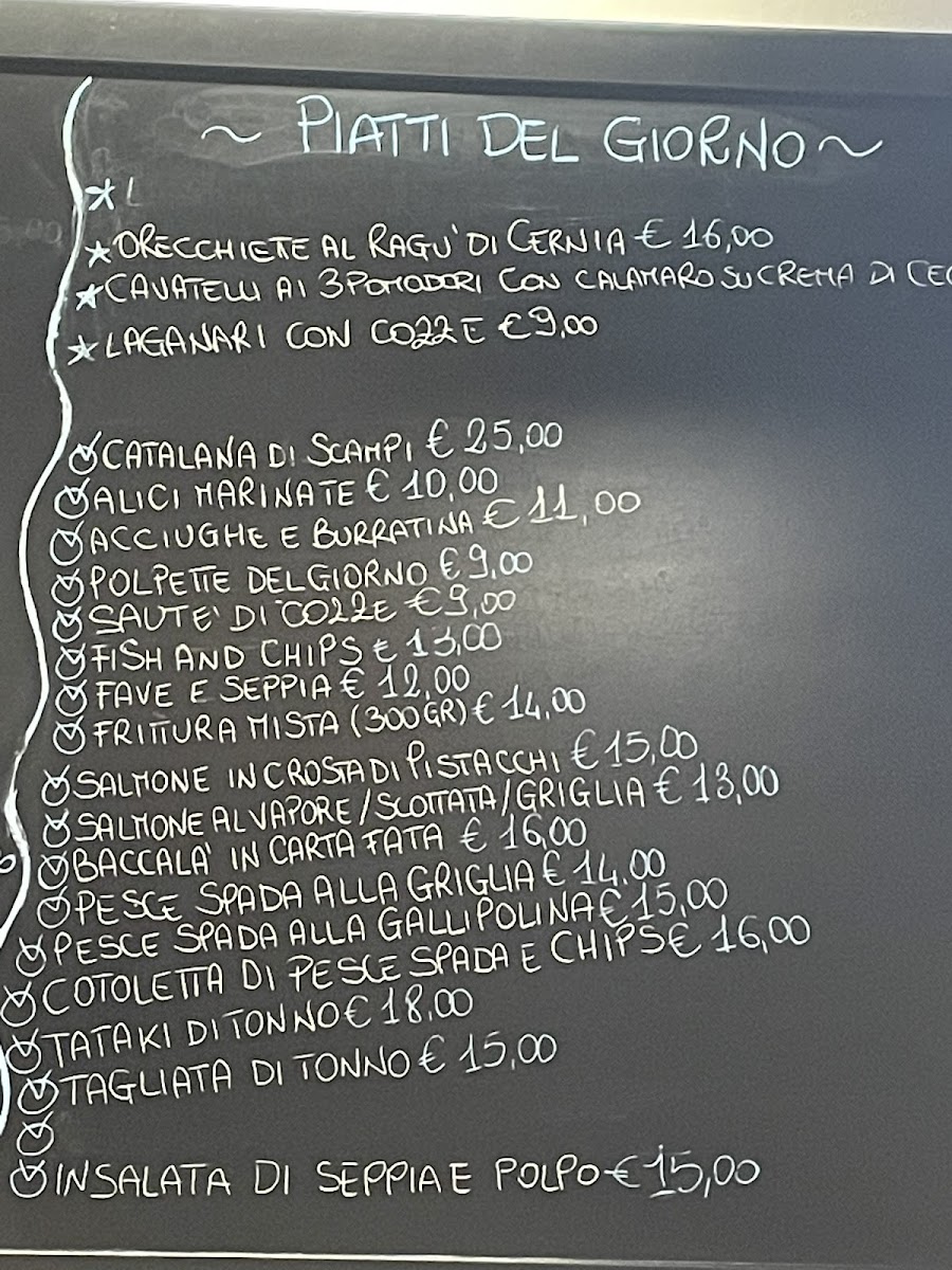 “ Highly recommend for those looking for a seafood treat. You can choose the fresh seafood and how you want it cooked, or choose from the blackboard (there was English menu). We picked 3 kinds of fish - tuna tartare, a ceviche (can remember the fish) and fired swordfish - they were all delicately flavored and very umami! We totally enjoyed it. We also ordered a classic Orecchiette - one of the best we had in Lecce (so it’s puzzling to see the negative review from someone). The staff were super friendly and service. Sure, this was a little pricey given it’s a fine dining place but the quality of dishes is more than reasonable . Highly recommend! Also love that they serve coffee in a classic moka pot ”